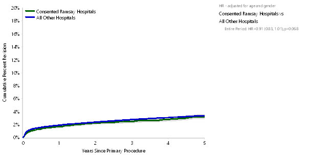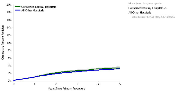 The following graphs show the performance of 16 Ramsay Health Care facilities that contribute data to the AOANJRR. These graphs are based on a 5-year reporting period between 2013 - 2018.