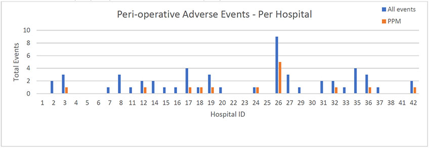 In this graph the blue bar represents an adverse event before or during surgery: these events are generally classified as cardiac, cerebral, vascular, bleeding, or device related. PPM stands for Permanent Pacemaker – this is something that is typically required after a cardiac event.
