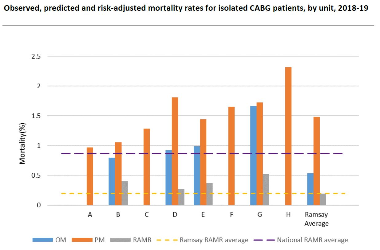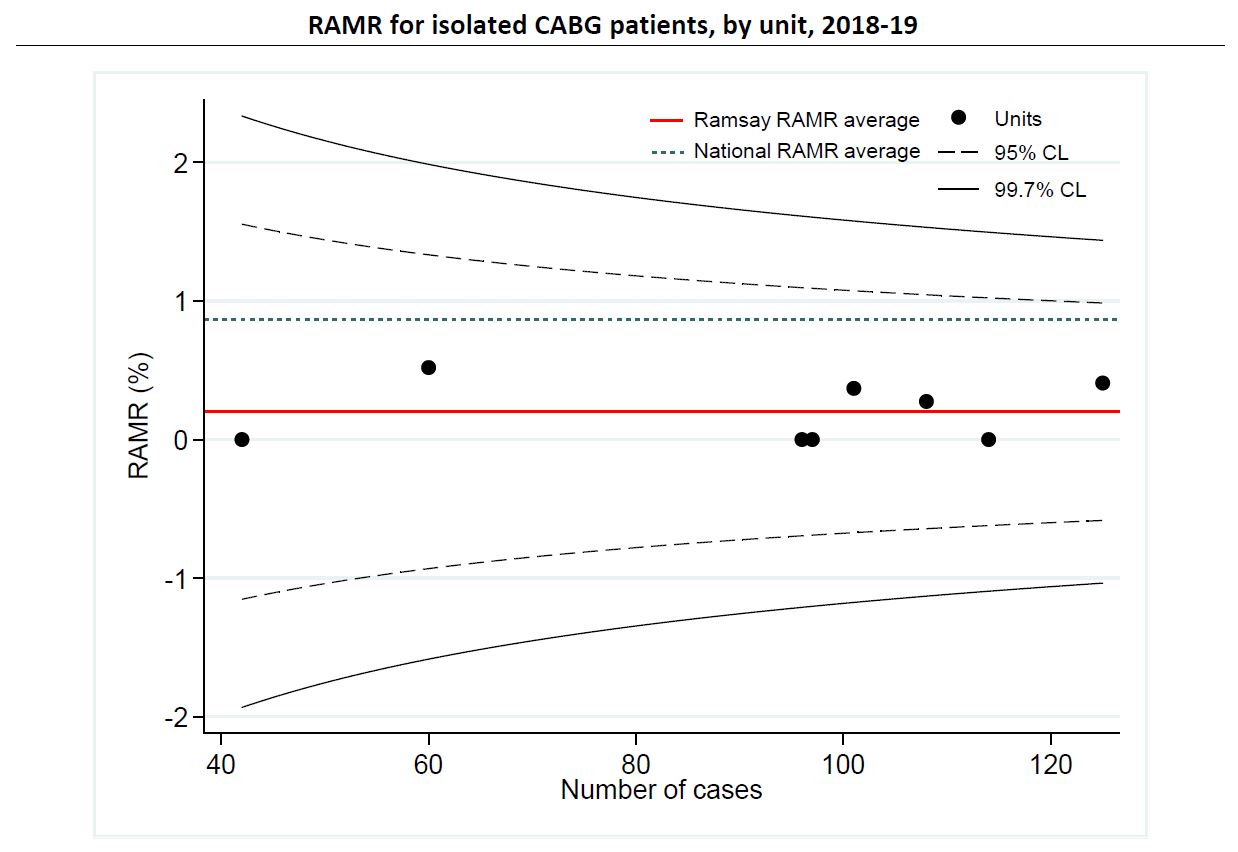 The ANZSCTS Database uses an all-procedures risk-adjustment model. In 2018-19, all Ramsay Health Care units had risk-adjusted mortality rates that were lower than the predicted mortality (PM) rates. All eight units were within the 95% control limit (CL) on funnel plot analyses for risk-adjusted mortality rate (RAMR) amongst the Ramsay Health Care cohort. The average RAMR was 0.2% for Ramsay Health Care units and 0.9% for the national cohort.