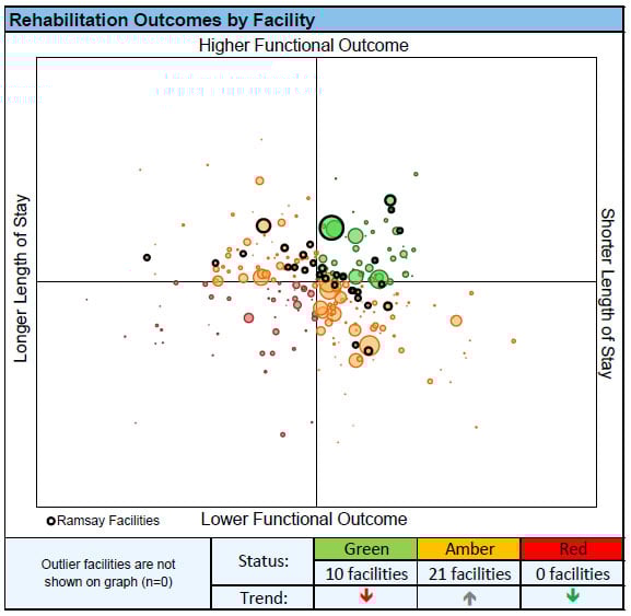 We aim to have all of our facilities in the top two quadrants, as they represent the achievement of higher functional outcomes. Ideally our facilities would achieve optimal functional outcomes with minimal hospitalisation. Facilities that achieve this are represented in the top right-hand quadrant and are coloured in green. Facilities that have lower than average functional outcomes and longer than average hospital stays are shown in red in the bottom left quadrant.
